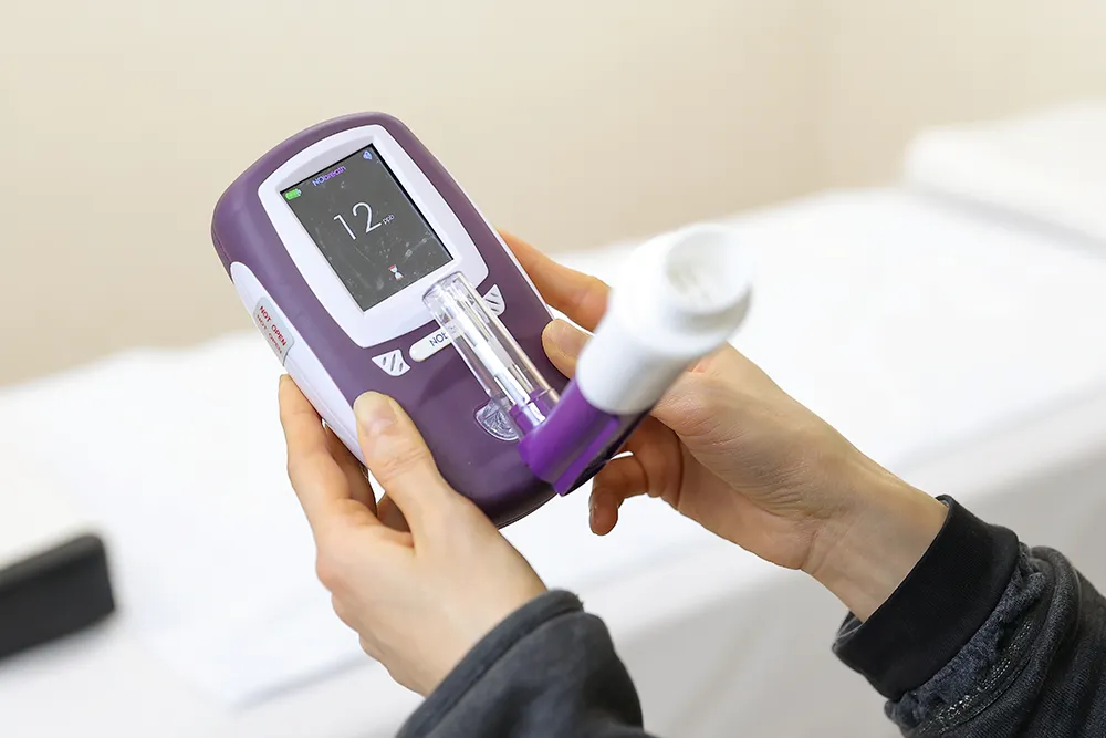 息を吐いて頂くだけで気道内のアレルギー性の炎症の程度が数字で表示され、気管支喘息の診断や気道炎症の程度の把握に役立ちます。