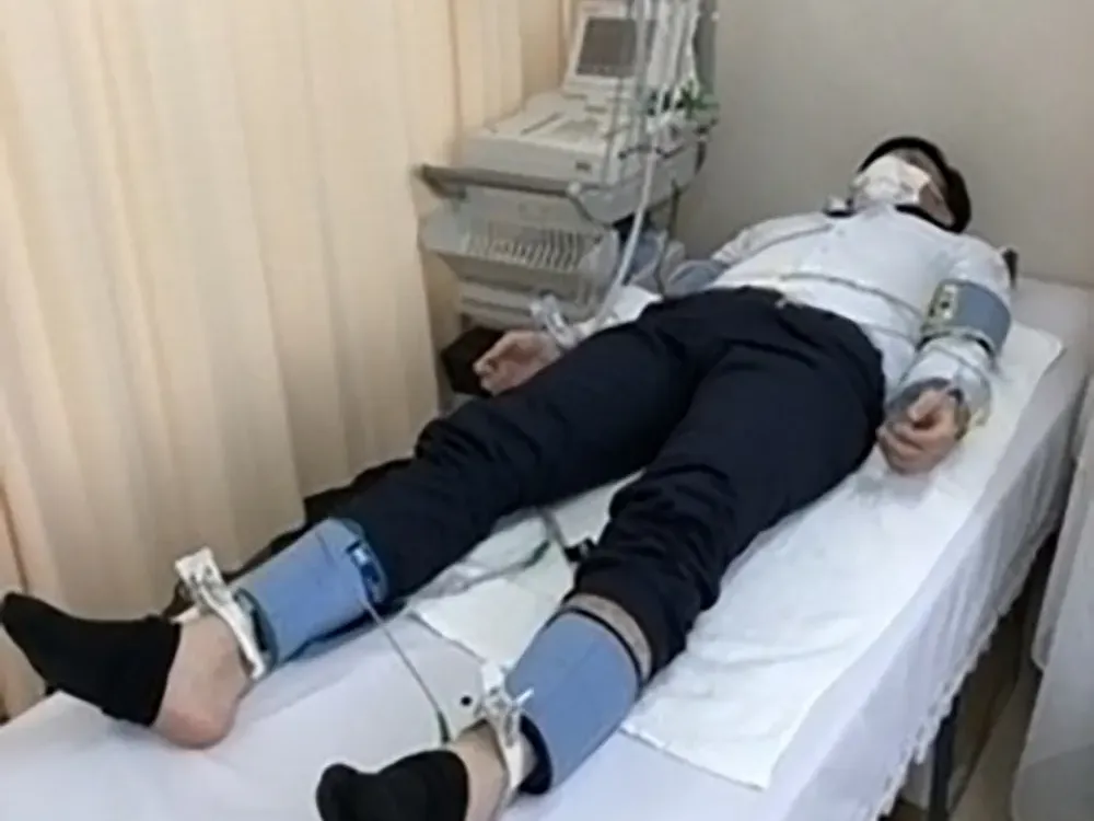 血管の硬さ(CAVI)と詰まり(ABI)を調べる検査です。CAVIは心臓から足首までの血管の硬さを示し、血管年齢が分かります。ABIは足の血管の詰まりを評価し、脳・心血管疾患予防に役立ちます。